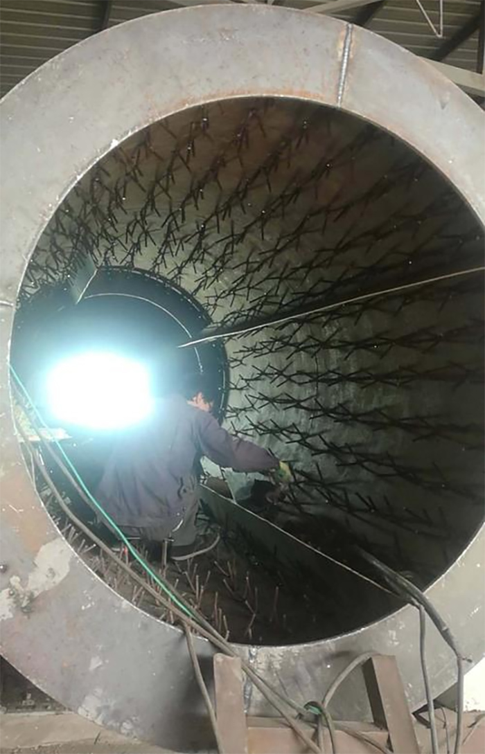 另外,部分回轉窯采用輕質澆注料或者纖維板等作為隔材料,工作層采用重質澆注料(金屬抓釘錨固)雙層澆注結構,可以合理控制回轉窯外壁溫度。該結構采用金屬件把耐火材料和筒體連為一體,不存在耐火磚脫落問題,但是金屬件焊接質量和澆注料中水份烘干排出是關鍵。
