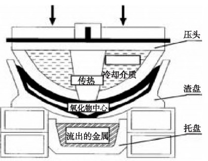 壓榨回收法的工作原理是將熱鋁灰從壓濾機(jī)上部裝入,對熱鋁灰施加靜壓或者動壓,將熔融鋁擠壓出。例如SPM法、MADOC法、COMPAL法、Thepress法等,原理如圖2所示。壓頭施加壓力,爐渣內(nèi)的金屬受壓流向下層容器,在此期間鋁灰氧化迅速停止,形成的金屬殼將氧化物包裹起來,這樣既可以控制灰塵,也能減少煙氣的排出,而熱量由循環(huán)冷卻水帶走,爐渣的溫度逐漸降低到450℃以下,防止氧化的二次發(fā)生。
