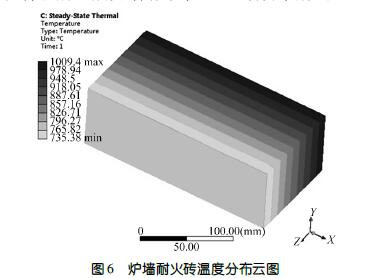 焚燒爐運行過程中爐墻受熱,爐墻內、外溫度存在差異。爐墻耐火磚模擬分析的溫度分布云圖如圖6 所示,構成爐墻的碳化硅磚由內部到外部存在較大的溫度梯度。工作面與非工作面溫度的差異使耐火磚向火面產生的膨脹比背火面的大。同時,焚燒爐內不同燃燒區域爐墻溫度分布不均,使爐墻在溫度較高的部位膨脹量較大。由于爐墻受爐體尺寸的約束,使整個爐墻產生較大的內應力,溫度越高的區域產生的內應力越大,這導致高溫區爐墻有向爐內凸起、鼓包的趨勢。爐墻鼓包、凸起還與超負荷運營、工藝溫度控制、起停爐頻次、操作水平以及爐墻設計有關。
