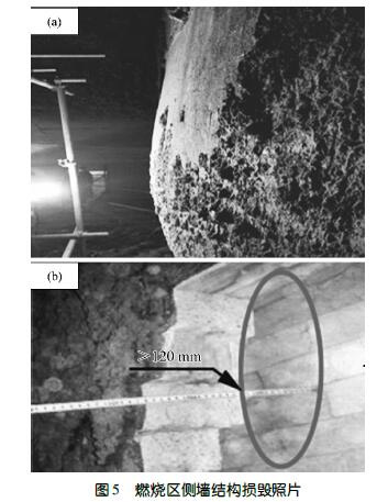 不同焚燒階段,工藝溫度差異較大,各段爐墻受熱不均勻。其中,燃燒段是溫度較高區域,主要是絕熱爐墻和風冷爐墻兩種結構,風冷爐墻的穩定性要明顯好于絕熱爐墻的。但是無論哪種結構,服役時間較長以后,均會出現鼓包凸起。圖5(a)是絕熱爐墻服役一段時間后爐墻明顯鼓包照片,中心區域凸起高度達到200 mm 以上。圖5(b)示出了爐墻服役過程中的風冷爐墻,殘余風冷爐墻空氣夾層厚度由設計的60 mm 擴展為120 mm。