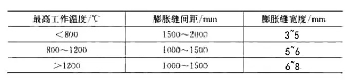 ②現場澆注的爐體。現場澆注的耐火澆注料爐體留設膨脹縫的間距和寬度。可參考表1所示。表中數值適用于黏土質和高鋁質耐火澆注料。