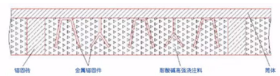 采用上述澆注料在回轉(zhuǎn)窯筒體的內(nèi)表面上澆注厚度不低于250mm。內(nèi)襯包括多塊呈軸向均勻分布固定于筒體內(nèi)表面的酸性或中性錨固磚,錨固磚兩側(cè)的筒體內(nèi)表面固定有多個(gè)均勻分布的金屬錨固件,再用耐酸堿高溫澆注料,該耐酸高強(qiáng)澆注料通過錨固磚和金屬錨固件與筒體連接為一體。局部?jī)?nèi)襯結(jié)構(gòu)如圖1所示。
